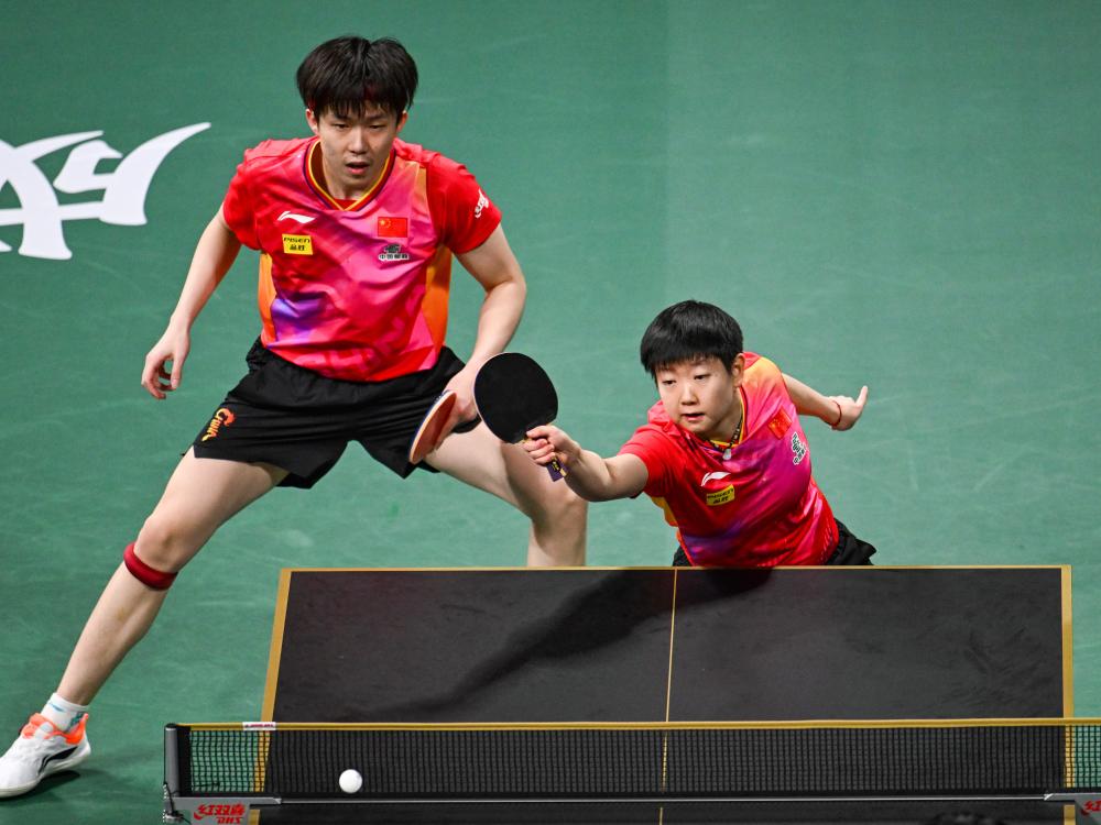 12月8日,中國(guó)隊(duì)組合王楚欽/孫穎莎(右)在混雙比賽中。新華社記者 王曦 攝