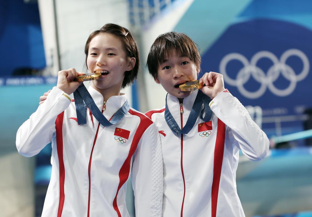 7月31日,冠軍中國選手陳芋汐(左)/全紅嬋在頒獎儀式上。當(dāng)日,在巴黎奧運會跳水女子雙人十米臺決賽中,陳芋汐/全紅嬋奪得金牌。新華社記者 張玉薇 攝
