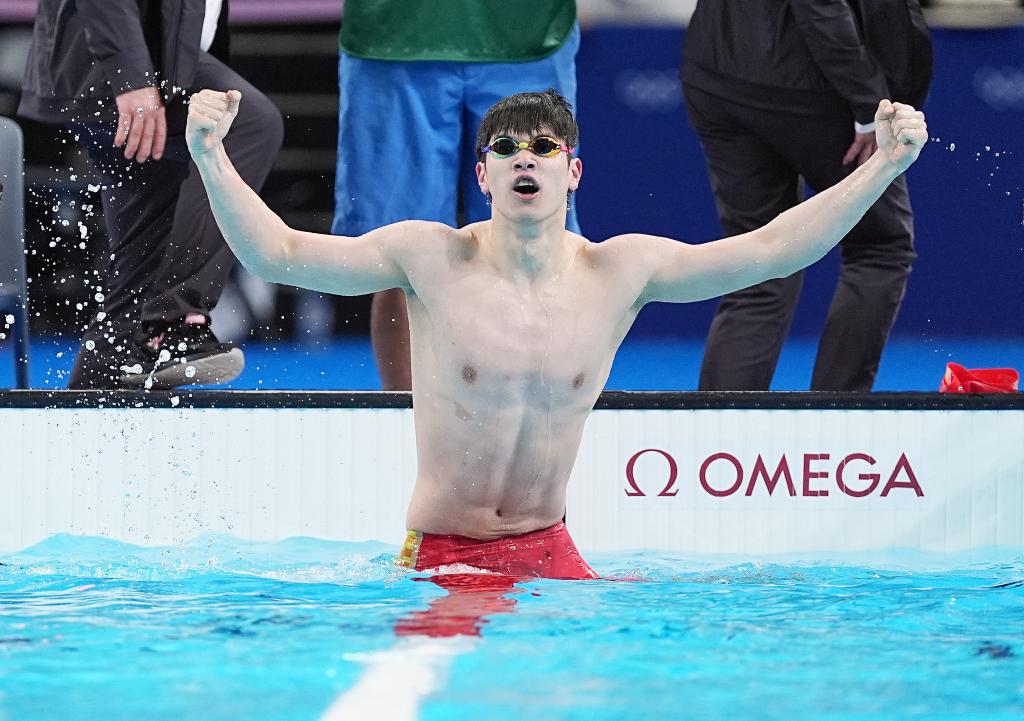 這是2024年7月31日,中國選手潘展樂在巴黎奧運(yùn)會(huì)游泳項(xiàng)目男子100米自由泳決賽后慶祝。新華社記者 杜宇 攝