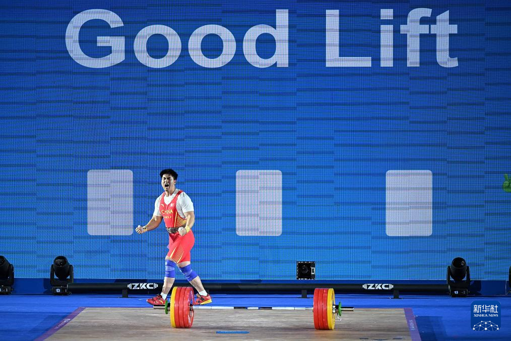 5月13日,中國選手錢飛翔在挺舉比賽中慶祝最后一次試舉成功。最終,他獲得抓舉、挺舉兩項季軍和總成績第四名。新華社記者 侯昭康 攝