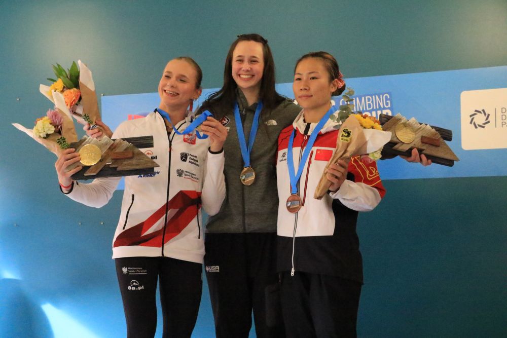女子前三名在頒獎儀式上,右一為鄧麗娟。中國國家攀巖隊供圖