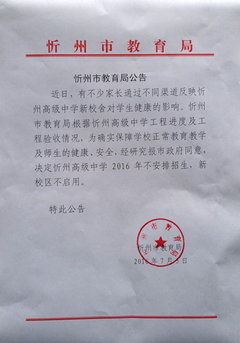 近日,有不少家長通過不同渠道反映忻州市高級中學(xué)新校舍對學(xué)生健康的影響。忻州市教育局根據(jù)忻州市高級中學(xué)工程進(jìn)度及工程驗(yàn)收情況,為確實(shí)保障學(xué)校正常教育教學(xué)及師生的健康、安全,經(jīng)研究報(bào)市政府同意,決定忻州市高級中學(xué)2016年不安排招生,新校區(qū)不啟用。