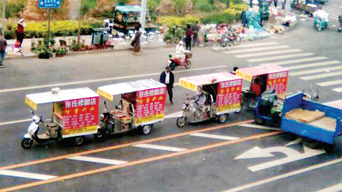在市區(qū)街頭經(jīng)常會出現(xiàn)大規(guī)模宣傳車隊,長時間停留在居民區(qū)或某街道,用高音喇叭不停地播放某商場促銷信息,嚴重擾民。還有一種現(xiàn)象,收舊家電者,每天早上6點多就在公園街早市用高音喇叭呼叫、演唱,直到中午才走,這種高分貝噪音長時間困擾著附近居民。給城管部門反映后能消停幾天,之后這些流動商販又會出現(xiàn)在另外的居民區(qū)。請相關(guān)部門管管流竄于市區(qū)的這些擾民噪音。(一網(wǎng)友攝于7月6日)