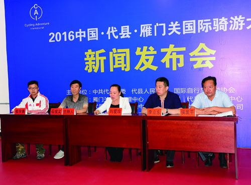 七月盛夏,古郡雁門,瓜果飄香,喜氣盈門。以“騎游中華第一關,逐鹿千年古驛道”為主題的2016中國·代縣·雁門關國際騎游大會定于7月29日至30日隆重舉行,將云集來自全球20多個國家和地區(qū)的1000多名在國際、國內自行車賽事中初具影響力的職業(yè)、業(yè)余選手參加。標準之高,規(guī)模之大,盛況空前。為了給雁門關國際騎游大會宣傳造勢,營造濃厚氛圍,大會組委會于7月20日下午在新城體育館會議室舉行2016中國·代縣·雁門關國際騎游大會新聞發(fā)布會,特邀來自省市新聞媒體的20多位記者參加。出席新聞發(fā)布會的領導有政府副縣長、大會組委會副主任劉愛珍,國家體育總局扶貧工作組組長、大會組委會副主任李立東,代縣體育運動管理中心主任、大會組委會委員侯發(fā)平,深圳天珺體育咨詢有限公司賽事總監(jiān)張學勇。