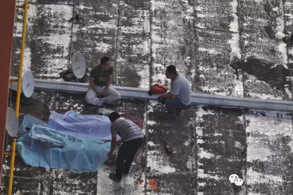 回想起那一瞬間,一位不愿意透露姓名的目擊者驚魂未定,據(jù)他介紹:“早上大概五點半左右,我和愛人正熟睡。突然,聽到外面”砰“的一聲,驚醒了我們,老婆還自言自語說樓上又有人往樓下亂扔?xùn)|西,話音剛落,又一物體重重的墜地的聲音傳來,匆忙起床,跑到窗口往下看,只見一女子面朝房頂趴在商鋪樓頂?!?/p>