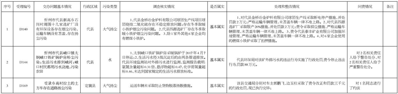 我市高度重視,立即組織查處,截至5月4日,督辦的3件群眾反映問題已辦結(jié)。其中,代縣確認(rèn)基本屬實的2件;定襄縣確認(rèn)屬實的1件。對于屬實已辦結(jié)的環(huán)保問題,分別采取了相應(yīng)處理措施,其中限產(chǎn)停產(chǎn)1件2家、查封扣押1件5家、罰款92.6萬元;目前,代縣對2名相關(guān)責(zé)任人給予警告處分、2名相關(guān)責(zé)任人給予嚴(yán)重警告處分;定襄縣對1名相關(guān)責(zé)任人進(jìn)行了約談;對3件群眾反應(yīng)問題調(diào)查處理情況進(jìn)行了信息公開。