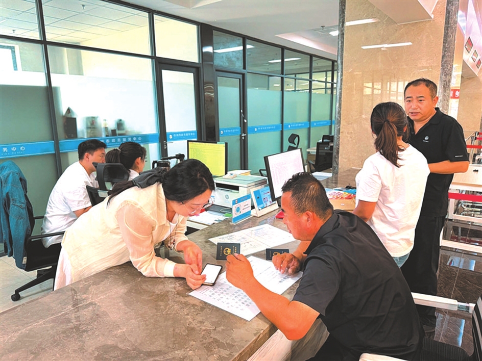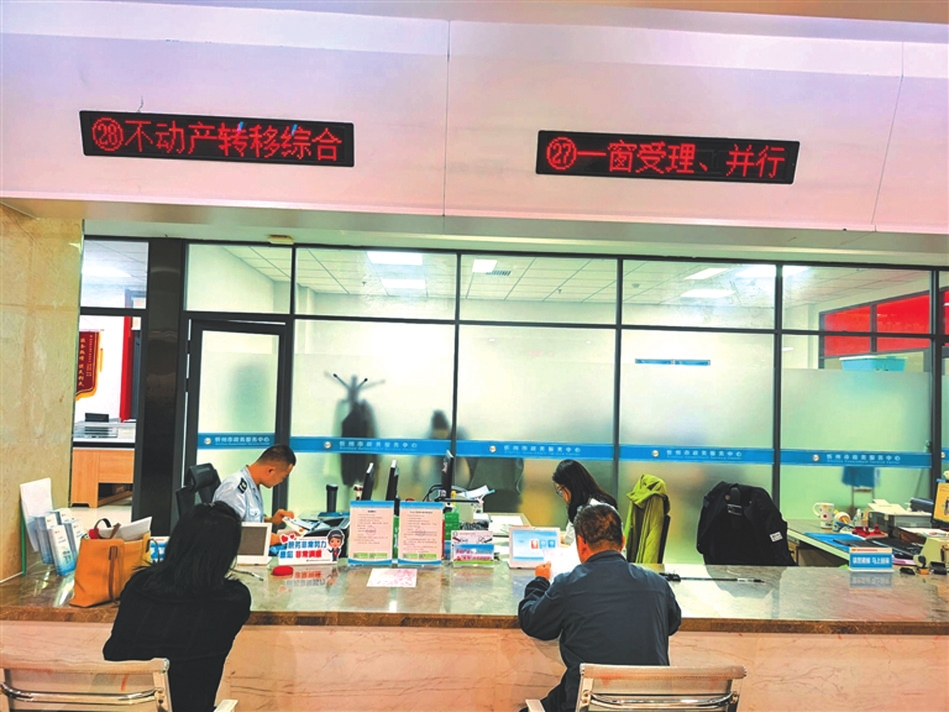 市政務(wù)大廳一樓不動產(chǎn)轉(zhuǎn)移綜合窗口,實現(xiàn)稅務(wù)+不動產(chǎn)登記一窗受理、并行辦理,日均辦理400件以上。