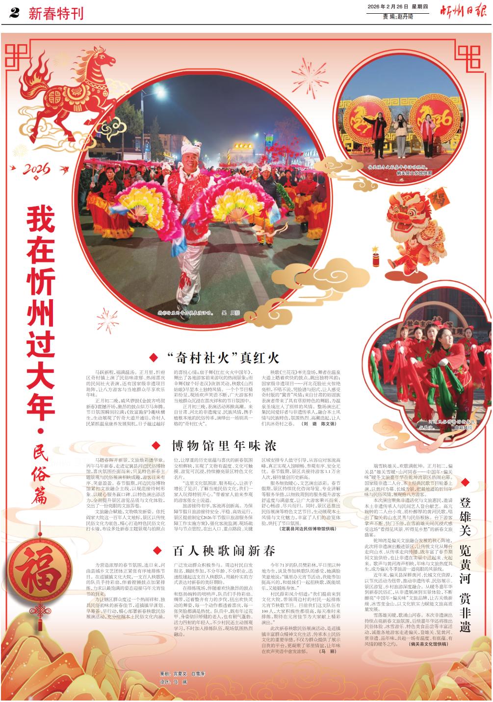 馬踏春暉開新景,文旅煥彩譜華章。丙午馬年新春,走進定襄縣河邊民俗博物館,喜慶氛圍撲面而來,只見特色新春主題景觀與民俗展演相映成趣,游客往來有序、笑意盈盈。春節(jié)假期,河邊民俗博物館緊扣文旅融合主線,以規(guī)范接待樹形象、以暖心服務(wù)贏口碑、以特色演出添活力,全面提升景區(qū)游覽品質(zhì)與文化體驗,交出了一份亮眼的文旅答卷。
