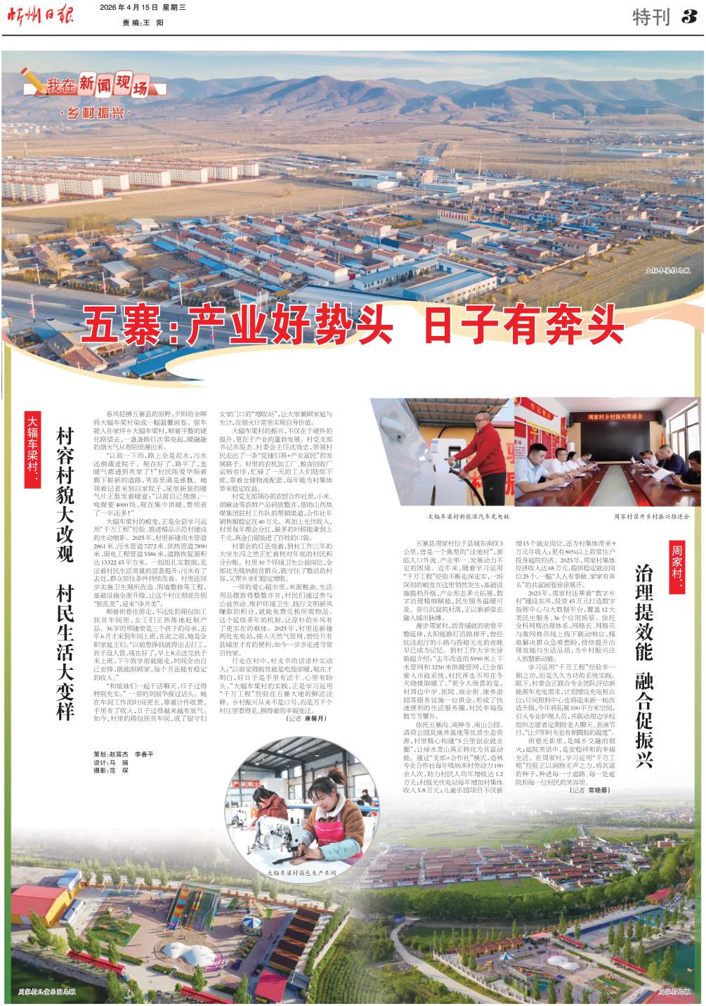大輻車梁村:村容村貌大改觀 村民生活大變樣 春風(fēng)輕拂五寨縣的原野,夕陽(yáng)的余暉將大輻車梁村染成一幅溫馨畫卷。驅(qū)車駛?cè)雽O家坪鄉(xiāng)大輻車梁村,順著平整的硬化路望去,一盞盞路燈次第亮起,暖融融的煙火氣從巷陌里漫出來(lái)。 “以前一下雨,路上全是泥水,污水還倒灌進(jìn)院子?,F(xiàn)在好了,路平了,連暖氣都通到我家了!”村民陳愛華指著腳下嶄新的道路,笑容里滿是感慨。她領(lǐng)著記者來(lái)到自家院子,屋里新裝的暖氣片正散發(fā)著暖意:“以前自己燒煤,一噸煤要4000塊,現(xiàn)在集中供暖,費(fèi)用省了一半還多!” 大輻車梁村的蛻變,正是全縣學(xué)習(xí)運(yùn)用“千萬(wàn)工程”經(jīng)驗(yàn)、推進(jìn)精品示范村建設(shè)的生動(dòng)縮影。2025年,村里新建雨水管道2861米、污水管道7272米、供熱管道7890米、弱電工程管道5586米,道路恢復(fù)面積達(dá)13322.45平方米。一組組扎實(shí)數(shù)據(jù),見證著村民生活質(zhì)量的顯著提升:污水有了去處,群眾居住條件持續(xù)改善。村里還同步實(shí)施衛(wèi)生廁所改造、圍墻整修等工程,基礎(chǔ)設(shè)施全面升級(jí),讓這個(gè)村莊徹底告別“臟亂差”,迎來(lái)“凈齊美”。 順著街巷往前走,不遠(yuǎn)處的箱包加工扶貧車間里,女工們正熟練地趕制產(chǎn)品。36歲的邢建榮是三個(gè)孩子的母親,去年6月才來(lái)到車間上班,在此之前,她是全職家庭主婦?!耙郧跋霋赍X就得出去打工,孩子沒(méi)人管,現(xiàn)在好了,早上8點(diǎn)送完孩子來(lái)上班,下午放學(xué)前就能走,時(shí)間全由自己安排,既能照顧家,每個(gè)月還能有穩(wěn)定的收入?!?/p> “和姐妹們一起干活聊天,日子過(guò)得特別充實(shí)?!币慌缘膭Ⅺ惾A接過(guò)話頭。她在車間工作的時(shí)間更長(zhǎng),靠著計(jì)件收費(fèi),手里有了收入,日子過(guò)得越來(lái)越有底氣。如今,村里的箱包扶貧車間,成了留守婦女家門口的“增收站”,讓大家兼顧家庭與生計(jì),在煙火日常里實(shí)現(xiàn)自身價(jià)值。 大輻車梁村的振興,不僅在于硬件的提升,更在于產(chǎn)業(yè)的蓬勃發(fā)展。村黨支部書記蘇俊杰、村委會(huì)主任沈效忠,帶領(lǐng)村民走出了一條“黨建引領(lǐng)+產(chǎn)業(yè)富民”的發(fā)展路子。村里的農(nóng)機(jī)加工廠、糧食回收廠運(yùn)轉(zhuǎn)有序,忙碌了一天的工人們陸續(xù)下班,靠著倉(cāng)儲(chǔ)物流配套,每年能為村集體帶來(lái)穩(wěn)定收益。 村黨支部領(lǐng)辦的農(nóng)貿(mào)合作社里,小米、胡麻油等農(nóng)特產(chǎn)品碼放整齊,借助山西焦煤集團(tuán)駐村工作隊(duì)的幫銷渠道,合作社年銷售額穩(wěn)定在40萬(wàn)元。再加上光伏收入,村里每年都會(huì)分紅,最多的時(shí)候能拿到上千元,真金白銀裝進(jìn)了百姓的口袋。 村委會(huì)的燈還亮著,到村工作三年的大學(xué)生馮之然正忙著核對(duì)年底的村民積分臺(tái)賬。村里10個(gè)環(huán)境衛(wèi)生公益崗位,全部?jī)?yōu)先吸納脫貧群眾,既守住了整潔的村容,又幫鄉(xiāng)親們穩(wěn)定增收。 一旁的愛心超市里,米面糧油、生活用品擺放得整整齊齊,村民們通過(guò)參與公益勞動(dòng)、維護(hù)環(huán)境衛(wèi)生、踐行文明新風(fēng)賺取的積分,就能免費(fèi)兌換所需物品。這個(gè)延續(xù)多年的機(jī)制,讓淳樸的鄉(xiāng)風(fēng)有了更實(shí)在的載體。2025年,村里還新建兩處充電站,接入天然氣管網(wǎng),曾經(jīng)只有縣城里才有的便利,如今一步步走進(jìn)尋常百姓家。 行走在村中,村支書的話語(yǔ)樸實(shí)動(dòng)人:“以前覺得脫貧就是吃飽穿暖,現(xiàn)在才明白,好日子是手里有活干、心里有盼頭?!贝筝椳嚵捍宓膶?shí)踐,正是學(xué)習(xí)運(yùn)用“千萬(wàn)工程”經(jīng)驗(yàn)在五寨大地的鮮活詮釋。鄉(xiāng)村振興從來(lái)不是口號(hào),而是萬(wàn)千個(gè)村莊里看得見、摸得著的幸福變遷。(記者 康馨月) 周家村:治理提效能融合促振興 五寨縣周家村位于縣城東南僅3公里,曾是一個(gè)典型的“洼地村”,面臨人口外流、產(chǎn)業(yè)單一、發(fā)展動(dòng)力不足的困境。近年來(lái),隨著學(xué)習(xí)運(yùn)用“千萬(wàn)工程”經(jīng)驗(yàn)不斷走深走實(shí),一場(chǎng)深刻的蛻變?cè)谶@里悄然發(fā)生:基礎(chǔ)設(shè)施提檔升級(jí),產(chǎn)業(yè)形態(tài)多元拓展,數(shù)字治理精細(xì)賦能,民生服務(wù)溫暖可及。昔日沉寂的村落,正以嶄新姿態(tài)融入城市脈搏。 漫步周家村,瀝青鋪就的街巷平整延伸,太陽(yáng)能路燈沿路排開,曾經(jīng)坑洼泥濘的小路與昏暗無(wú)光的夜晚早已成為記憶。到村工作大學(xué)生徐敬超介紹:“去年改造的5990米上下水管網(wǎng)和3250米供暖管網(wǎng),已全部接入市政系統(tǒng),村民再也不用在冬天燒煤取暖了?!备钊诵老驳氖牵逯苓呏袑W(xué)、醫(yī)院、商業(yè)街、康養(yǎng)游園等服務(wù)設(shè)施一應(yīng)俱全,形成了快速便利的生活服務(wù)圈,村民幸福指數(shù)節(jié)節(jié)攀升。 依托五寨溝、南禪寺、南山公園、清荷公園及康養(yǎng)基地等優(yōu)質(zhì)生態(tài)資源,村里精心構(gòu)建“5公里創(chuàng)業(yè)就業(yè)圈”,讓綠水青山真正轉(zhuǎn)化為共富動(dòng)能。通過(guò)“支部+合作社”模式,造林專業(yè)合