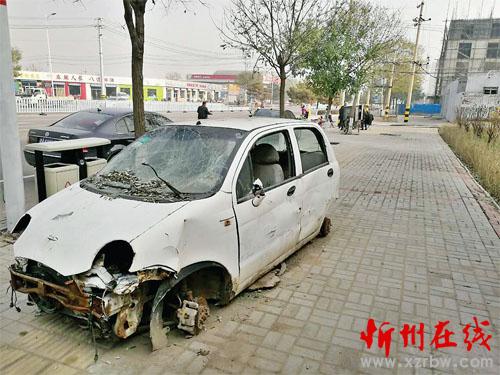 忻州城區(qū)長征西街路南、武警支隊(duì)大門西側(cè),有輛破爛不堪的汽車,長時(shí)間停在人行道上,且占據(jù)著盲道。希望相關(guān)部門能夠及時(shí)處理。(張宏志 攝)