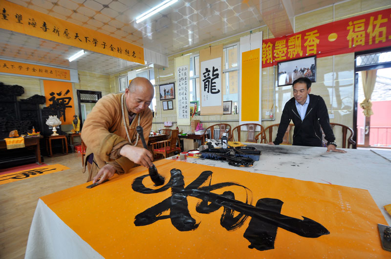 29日,中國佛教講經(jīng)交流會(huì)在五臺(tái)山召開之際,記者走訪了東臺(tái)頂望海寺釋覺一法師,他在勤修佛法的同時(shí)在書畫藝術(shù)上也自成一家。他認(rèn)為,佛法與書畫關(guān)系密切相通之處,學(xué)習(xí)佛法可促進(jìn)書法境界的提升,有助于佛法的弘揚(yáng)。