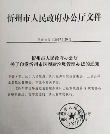 第一條 為加強(qiáng)餐廚垃圾管理,維護(hù)市區(qū)市容環(huán)境衛(wèi)生,促進(jìn)餐廚垃圾無害化處理和資源化利用,保障市民身體健康,根據(jù)《中華人民共和國固體廢物污染環(huán)境防治法》、國務(wù)院《城市市容和環(huán)境衛(wèi)生管理?xiàng)l例》、建設(shè)部《城市生活垃圾管理辦法》(建設(shè)部令2007年第157號(hào))、商務(wù)部《餐飲業(yè)經(jīng)營管理辦法(試行)》(商務(wù)部令2014年第4號(hào))、《忻州市人民政府辦公廳關(guān)于印發(fā)忻州市區(qū)垃圾管理辦法的通知》(忻政辦發(fā)〔2014〕1號(hào))和《忻州市人民政府辦公廳關(guān)于印發(fā)忻州市區(qū)生活垃圾分類管理實(shí)施辦法的通知》(忻政辦發(fā)〔2014〕134號(hào))等法規(guī)和規(guī)定,結(jié)合市區(qū)實(shí)際,制定本辦法。