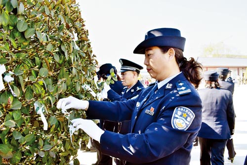在烈士紀(jì)念碑前,大家重溫了入黨誓詞,許下莊嚴(yán)神圣的諾言,向革命烈士紀(jì)念碑敬獻(xiàn)花圈,集體脫帽低頭默哀,緬懷革命先烈勇于拼搏、甘于奉獻(xiàn)的崇高品質(zhì)。民警們參觀了烈士紀(jì)念碑,了解烈士事跡,并紛紛將胸前的小白花掛到了紀(jì)念碑旁邊的樹上,表示要牢記人民警察的神圣誓言和莊嚴(yán)使命,踐行“忠誠、為民、公正、奉獻(xiàn)”的人民警察核心價(jià)值觀,傳承革命烈士的精神和情懷,履行好維護(hù)社會和諧穩(wěn)定的職責(zé),以飽滿的熱情和昂揚(yáng)的斗志為公安事業(yè)貢獻(xiàn)自己的全部力量。(魯明強(qiáng) 劉慧云)