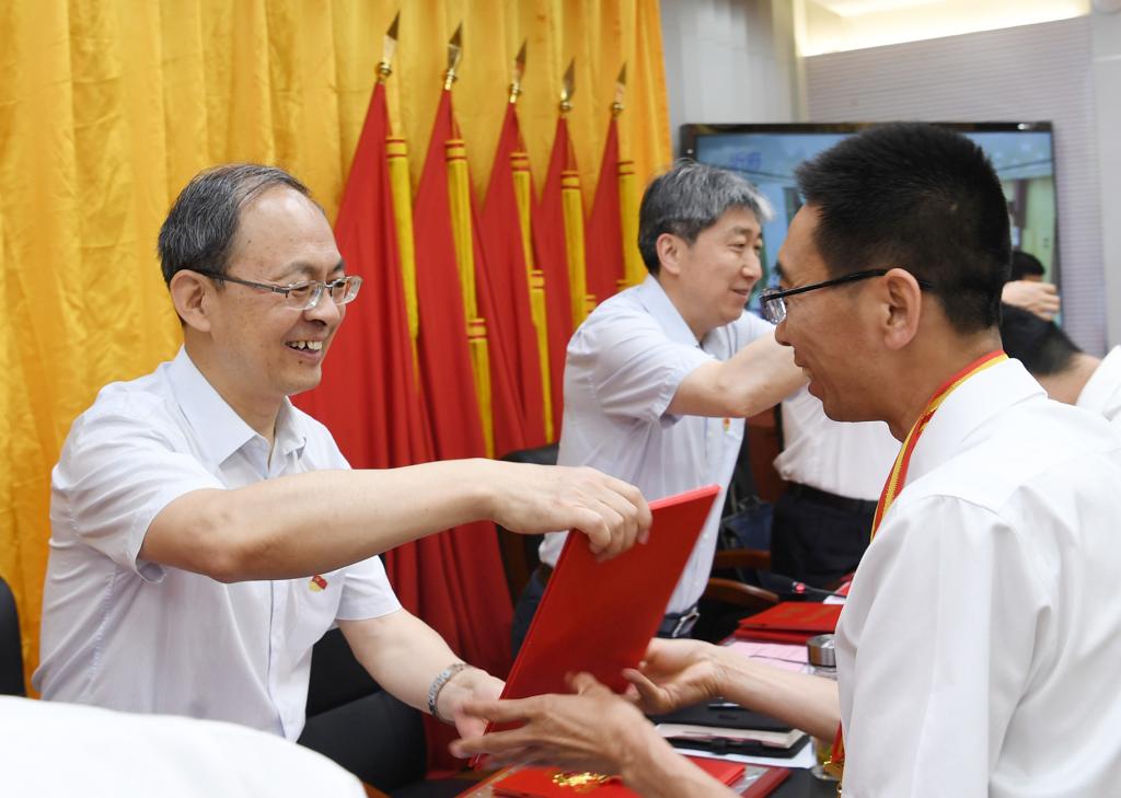 鄭連生為受表彰的優(yōu)秀個人和先進集體代表頒獎。劉紀森 攝 鄭連生代表市委向受到表彰的全市優(yōu)秀共產(chǎn)黨員、優(yōu)秀黨務工作者、先進基層黨組織表示熱烈的祝賀,向奮戰(zhàn)在各條戰(zhàn)線的共產(chǎn)黨員致以節(jié)日的問候,向為黨和人民作出犧牲奉獻的前輩先烈致以崇高的敬意。他指出,中國共產(chǎn)黨在一百年的接續(xù)奮斗中,以其堅定的政治信仰、正確的政治方向、高度的政治自覺、持久的政治擔當和高尚的政治情懷,在實現(xiàn)中華民族偉大復興的百年奮斗中創(chuàng)造了一個又一個歷史奇跡。一百年來,忻州在黨的正確領導下,在革命、建設和改革各個歷史時期都取得了巨大成績,特別是黨的十八大以來,全市各級黨員干部和群眾響應黨的號召,貫徹黨的主張,擔當黨的使命,攻堅全面脫貧,推動轉(zhuǎn)型發(fā)展。進入新時代,黨帶領全國人民開啟了全面建設社會主義現(xiàn)代化國家的新征程,全市各級黨員干部都要緊緊圍繞在以習近平同志為核心的黨中央周圍,不忘初心,牢記使命,凝心聚力,持續(xù)奮斗,在奮力譜寫全面建設社會主義現(xiàn)代化國家忻州篇章的新征程中奮勇爭先、建功立業(yè)。
