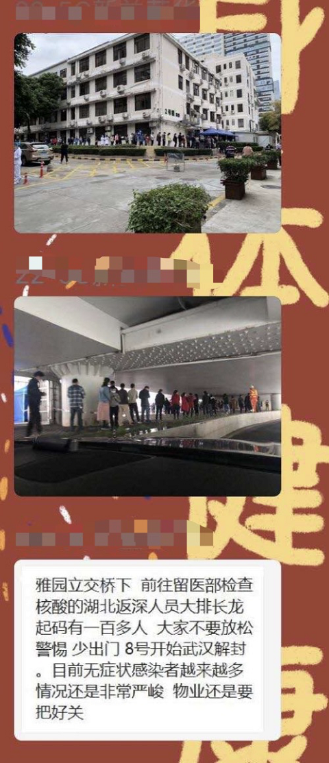 “雅園立交橋下,前往留醫(yī)部檢查核酸的湖北返深人員大排長龍,起碼有一百人,大家不要放松警惕,少出門?!?日,這段文字和兩張大排長龍的圖片在網(wǎng)上流傳。記者9日從深圳市人民醫(yī)院獲悉,該情況并不屬實(shí)。一份核酸取樣平均時(shí)間為數(shù)秒鐘,醫(yī)院核酸檢測排隊(duì)患者一般在10~50人之間,因?yàn)樾枰3?米隔離,隊(duì)伍會比較長,但也未超過百米,更不存在排出醫(yī)院大門外或雅園立交橋下,市民無需緊張。