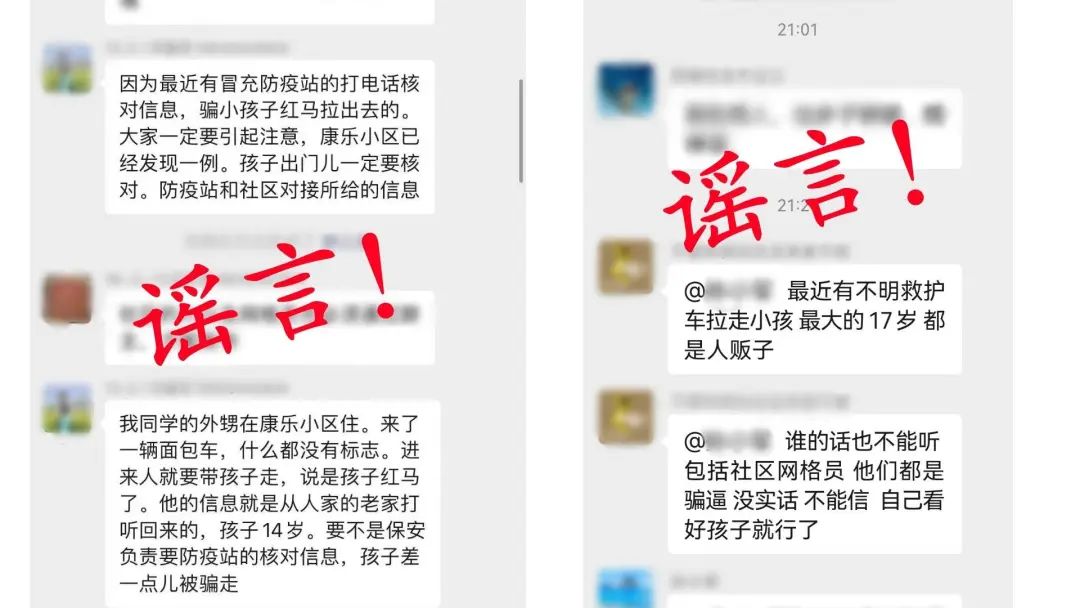 近日,本地微信群傳播:“最近有冒充防疫站的打電話核對信息,騙小孩紅馬拉出去的。大家一定要引起注意,康樂小區(qū)已經(jīng)發(fā)現(xiàn)一例”、“最近有不明救護車拉走小孩,最大的17歲,都是人販子”。