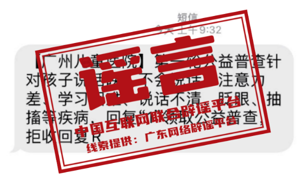 真相:近期,有社會醫(yī)療機(jī)構(gòu)冒用廣州市婦女兒童醫(yī)療中心(以下簡稱“廣州婦兒中心”)名稱,通過群發(fā)短信的方式,宣傳該中心正在進(jìn)行“身高普查”“針對孩子說話晚,不會說話、注意力差等”等公益普查項目。對此,廣州婦兒中心發(fā)布聲明稱,目前,該中心未就上述公益普查項目與其他任何醫(yī)療機(jī)構(gòu)或社會組織存在合作關(guān)系,也未曾通過短信、電話向廣大患者推送過醫(yī)療信息。特此提醒廣大市民,切勿輕信此類信息,并注意保護(hù)個人隱私。(來源:廣東省互聯(lián)網(wǎng)舉報中心)