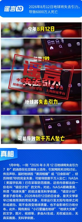 ??健康與科普領(lǐng)域謠言違背客觀規(guī)律?!叭搜椎鞍资恰黾用庖吡Α姆▽殹笨桃饪浯笤撎幏剿幍呐R床用途,忽略其特定醫(yī)療場(chǎng)景與使用風(fēng)險(xiǎn);所謂“大棚草莓、冷庫葡萄、進(jìn)口車?yán)遄?、染色砂糖橘是冬天水果界四大毒王”謠言片面解讀農(nóng)產(chǎn)品種植與保鮮方式,缺乏科學(xué)依據(jù);“四川兩只雄性大熊貓首次成功自然交配”純屬為吸引流量而捏造的獵奇內(nèi)容,其視頻畫面為AI生成;“2026年8月12日地球?qū)⑹ヒ?,?dǎo)致6000萬人死亡”更是無中生有的荒謬謠言。