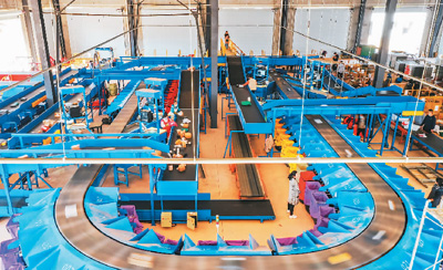 在湖南省永州市藍(lán)山縣創(chuàng)品國際智慧物流園,智能分揀系統(tǒng)對快件包裹進(jìn)行有序分揀。彭 華攝(人民圖片)
