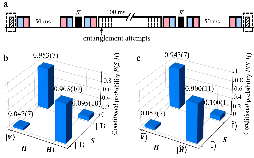 實(shí)驗(yàn)發(fā)現(xiàn),通過此方法制備出的通訊比特,可在數(shù)百毫秒的時間內(nèi)生成離子-光子糾纏;通過自旋回波方法可延長存儲比特的存儲壽命,實(shí)現(xiàn)相干時間達(dá)到秒量級的存儲量子比特。通過比較有無離子-光子糾纏生成操作時存儲比特的保真度變化,研究人員證實(shí)了兩種量子比特之間低于實(shí)驗(yàn)精度的串?dāng)_誤差,從而實(shí)現(xiàn)了無串?dāng)_的量子網(wǎng)絡(luò)節(jié)點(diǎn)。
