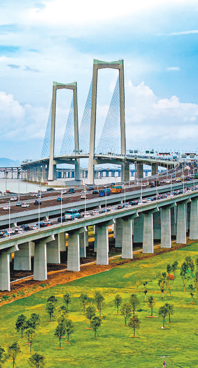 伶仃洋上壯觀的深中通道。蘇振飛攝(人民視覺(jué))