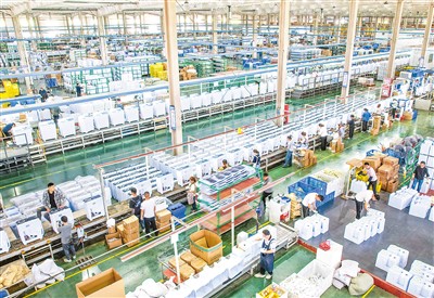 4月25日,在江蘇省宿遷市蘇宿工業(yè)園區(qū)的江蘇皓峰電器有限公司生產(chǎn)車間內(nèi),技術(shù)人員在生產(chǎn)加工銷往海內(nèi)外市場(chǎng)的智能洗衣機(jī)。陳少帥攝(人民視覺(jué))