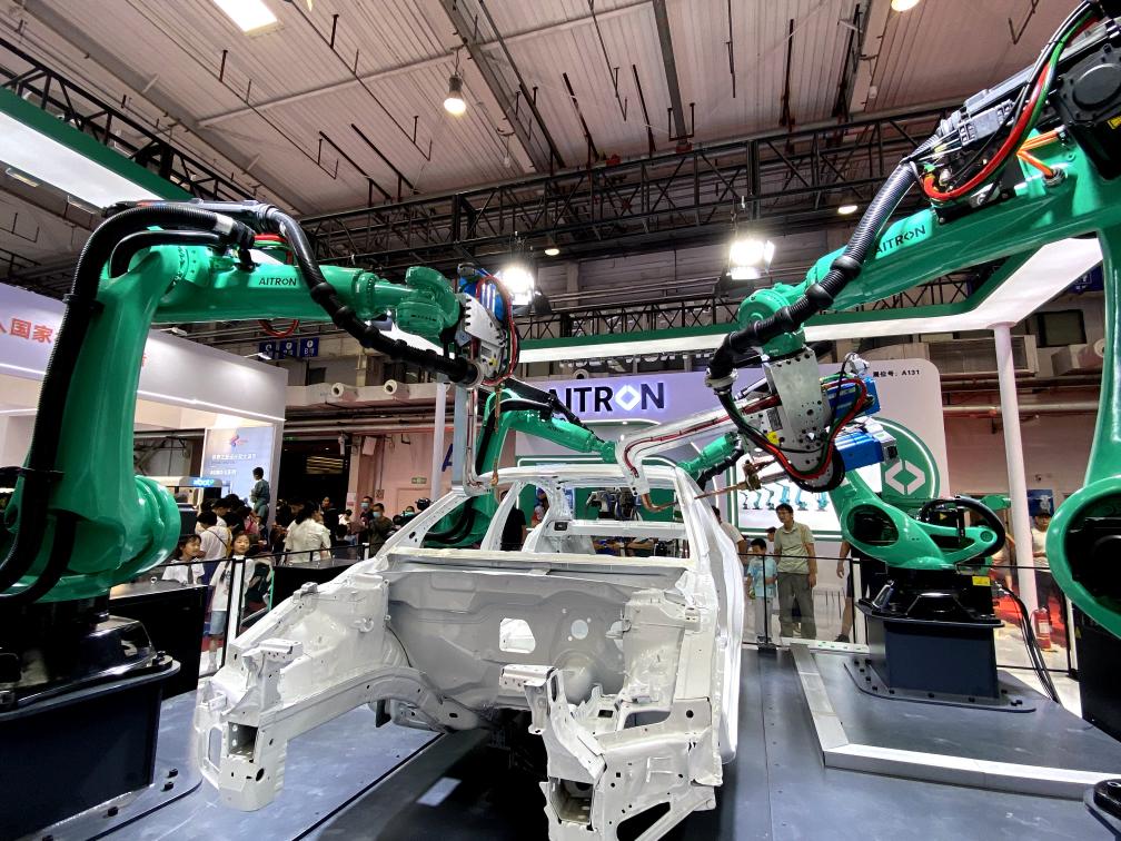 在世界機器人大會現(xiàn)場,各種機械手臂的“全能”操作也讓觀眾驚嘆不已。來自山東的工業(yè)機器人企業(yè)——煙臺艾創(chuàng)機器人科技有限公司首次參加大會,專門帶來多臺210公斤六軸機器人,伸展2.7米長的鋼鐵手臂,為觀眾現(xiàn)場展示汽車自動化焊接技術(shù)。
