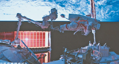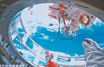 在北京航天飛行控制中心拍攝的航天員蔡旭哲(上)、宋令東(下)在氣閘艙艙門(mén)內(nèi)外工作的畫(huà)面。
