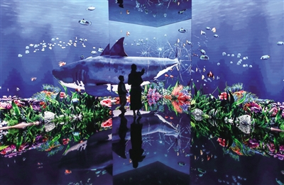 圖為游客在位于濟南市的山東省美術館參觀體驗“無限之?!背两紸I數(shù)字藝術展。新華社發(fā)(郝鑫城 攝)