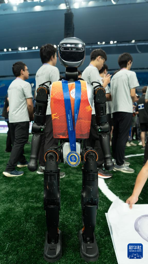 圖為清華火神隊使用的加速進化T1機器人佩戴冠軍獎牌。新華社發(fā)