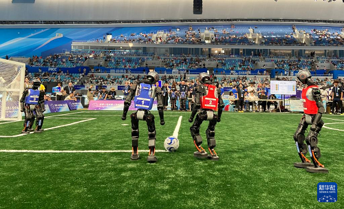 圖為2025世界人形機器人運動會上機器人在踢足球。新華社記者 魏夢佳 攝