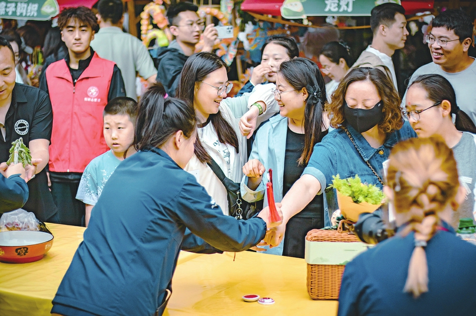 游客在忻州古城體驗端午民俗活動。本報通訊員攝 “早聽聞端午飲黃酒頗有講究,今日一嘗果然別具風味!”來自北京的游客端起黃酒輕抿一口,隨即豎起大拇指。他手腕上五彩絲線編織的繩結(jié)在陽光下閃爍,與手中的酒盞相映成趣。 端午飲黃酒蘊含著驅(qū)寒祛濕、強身健體的美好寓意。而端午假期的忻州古城,儼然成為傳統(tǒng)習俗體驗場。5月31日,泰山廟廣場人頭攢動,眾多外地游客專程趕來參與“童趣端午、粽香忻州”系列活動,在品黃酒、包粽子等沉浸式體驗中,感受端午民俗的獨特魅力。 “人浴蘭湯,事不忘于端午?!弊鳛槎宋绻?jié)的傳統(tǒng)習俗,浴蘭湯有洗去晦氣,帶來安康吉祥之意?;顒蝇F(xiàn)場,一盆盆蘭湯整齊擺放,前來體驗的人們排起長隊,工作人員手持菖蒲,蘸取蘭湯,輕柔地灑在人們的額頭、脖頸與雙手。與浴蘭湯的莊重不同,畫額活動充滿童趣。正在畫額的小朋友在家長的懷里探出頭來,工作人員手持毛筆,蘸取雄黃酒,在孩子的額頭正中輕點出一個圓圓的印記。有游客感慨:“帶孩子來體驗畫額,就是希望他能記住這些老祖宗傳下來的東西,讓傳統(tǒng)在下一代身上延續(xù)。” 除了祈福納祥的儀式,親手制作粽子更是端午不可或缺的煙火氣。很多游客忙得熱火朝天,節(jié)日氛圍十分濃郁。“和大家一起忙活,過節(jié)的味道更濃了?!眮碜院钡挠慰屠畲蠼闩e起手中包好的粽子,笑得十分開心。 華燈初上,當游客們捧著親手包的粽子、手腕系著五彩繩漫步古城,傳統(tǒng)習俗不再是書本里的鉛字,而是觸手可及的體驗與傳承,更是吸引游客的文化磁場。 高瑋 趙曼君 (責任編輯:梁艷) |