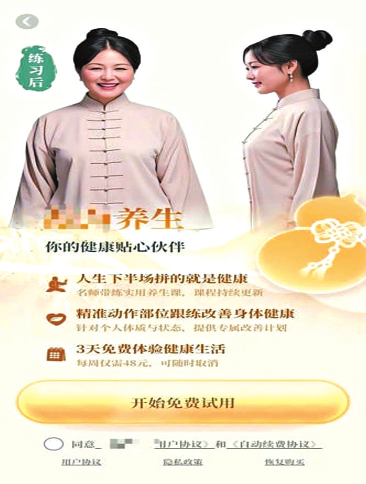 還有些App則更加離譜,下載完成后,點(diǎn)進(jìn)去的第一步就是要購買會(huì)員,之后才能正常使用。但在購買流程上,平臺(tái)卻耍起了花招。比如一款提供“養(yǎng)生指導(dǎo)服務(wù)”的App,頁面上會(huì)有一個(gè)大大的按鈕,寫著“開始免費(fèi)試用”。但在按鈕的旁邊,卻有一行非常不起眼的小字:“每周僅需48元,可隨時(shí)取消?!倍坏┯脩酎c(diǎn)擊開始試用,系統(tǒng)就會(huì)跳轉(zhuǎn)到自動(dòng)續(xù)費(fèi)的開通界面。如果是辨別能力差的老人,可能還以為是在填寫什么注冊信息。