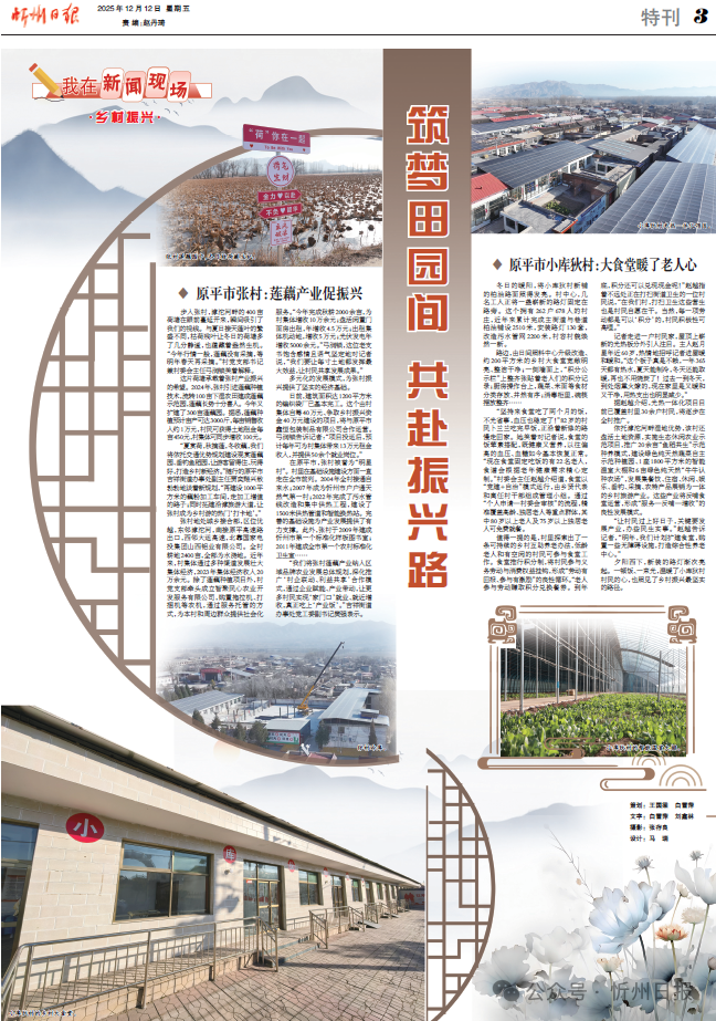 張村地處城鄉(xiāng)接合部,區(qū)位優(yōu)越,東鄰滹沱河,南接原平高速路出口,西鄰大運(yùn)高速,北靠國家電投集團(tuán)山西鋁業(yè)有限公司。全村耕地2400畝,全部為水澆地。近年來,村集體通過多種渠道發(fā)展壯大集體經(jīng)濟(jì),2023年集體經(jīng)濟(jì)收入20萬余元。除了蓮藕種植項(xiàng)目外,村黨支部牽頭成立智聚民心農(nóng)業(yè)開發(fā)服務(wù)有限公司,購置拖拉機(jī)、打捆機(jī)等農(nóng)機(jī),通過服務(wù)托管的方式,為本村和周邊群眾提供社會(huì)化服務(wù)。“今年完成秋耕2000余畝,為村集體增收10萬余元;盤活閑置門面房出租,年增收4.5萬元;出租集體機(jī)動(dòng)地,增收5萬元;光伏發(fā)電年增收5000余元?!惫瓭欐i,這位老支書飽含感情且語氣堅(jiān)定地對(duì)記者說,“我們要讓每寸土地都發(fā)揮最大效益,讓村民共享發(fā)展成果。”