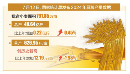 本報訊(記者王秀娟)7月12日,國家統(tǒng)計局發(fā)布2024年夏糧產(chǎn)量數(shù)據(jù),我省小麥面積791.85萬畝;總產(chǎn)49.64億斤,比上年增加0.22億斤,增長0.45%;單產(chǎn)626.95斤/畝,創(chuàng)歷史新高,比上年增加12.19斤/畝,增長1.98%。