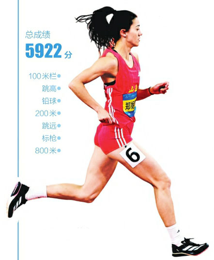 次日較量更為激烈。鄭妮娜力在跳遠(yuǎn)比賽中跳出6.08米,排名該項目第二;標(biāo)槍賽場雖遭遇挑戰(zhàn),但她仍以43.27米的成績拿下730分。在最后的800米決勝戰(zhàn)中,她頂住體能極限壓力,以2分19秒52的成績沖線,最終以5922分的總成績鎖定冠軍。