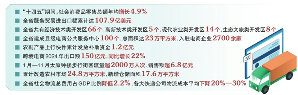 數(shù)字顯示,“十四五”期間,社會(huì)消費(fèi)品零售總額年均增長(zhǎng)4.9%,建成100個(gè)鄉(xiāng)村e(cuò)鎮(zhèn),打造了大同黃花等113個(gè)區(qū)域公用品牌。農(nóng)產(chǎn)品上行快件補(bǔ)助帶動(dòng)約33億元農(nóng)產(chǎn)品銷(xiāo)售。實(shí)物商品網(wǎng)上零售額年均增長(zhǎng)24.1%,高于全國(guó)17.1個(gè)百分點(diǎn)。
