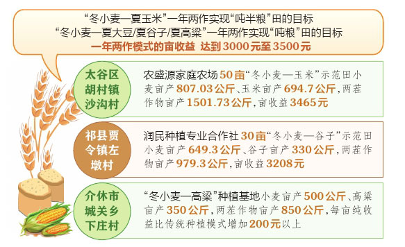令人欣喜的是,實踐給出了響亮而積極的回答。我省“冬小麥—夏玉米”一年兩作實現(xiàn)“噸半糧”田的目標,“冬小麥—夏大豆/夏谷子/夏高粱”一年兩作實現(xiàn)“噸糧”田的目標,一年兩作模式的畝收益達到3000元至3500元。太谷區(qū)胡村鎮(zhèn)沙溝村農盛源家庭農場50畝“冬小麥—玉米”示范田小麥畝產807.03公斤、玉米畝產694.7公斤,兩茬作物畝產1501.73公斤,畝收益3465元。祁縣賈令鎮(zhèn)左墩村潤民種植專業(yè)合作社30畝“冬小麥—谷子”示范田小麥畝產649.3公斤、谷子畝產330公斤,兩茬作物畝產979.3公斤,畝收益3208元。介休市城關鄉(xiāng)下莊村“冬小麥—高粱”種植基地小麥畝產500公斤、高粱畝產350公斤,兩茬作物畝產850公斤,每畝純收益比傳統(tǒng)種植模式增加200元以上。