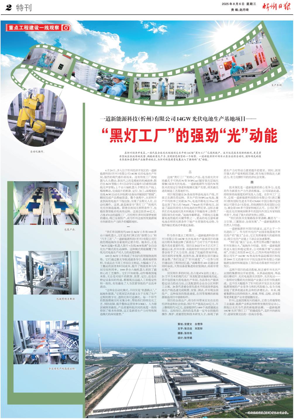 在忻州經濟開發(fā)區(qū),一座代表全球光伏制造頂尖水平的14GW“黑燈工廠”已悄然投產。這不僅是技術創(chuàng)新的勝利,更是資源型地區(qū)依托傳統優(yōu)勢、擁抱新質生產力、實現綠色轉型的一個縮影。一道新能源忻州項目以其全流程自動化、國際領先的技術參數和顯著的產業(yè)鏈帶動效應,為忻州的高質量發(fā)展注入了強勁的“光”動能。 6月24日,步入位于忻州經濟開發(fā)區(qū)的一道新能源科技(忻州)有限公司14GW光伏電池生產車間,強烈的現代感撲面而來。沒有傳統工廠的喧囂與人頭攢動,取而代之的是精密的機械韻律:數百臺AGV智能小車(自動導引運輸車)沿著預設路線無聲穿梭;上千臺六軸機器人手臂在生產線上精準舞動,完成硅片的抓取、定位、加工;高精度的在線AOI(自動光學檢測)設備如同敏銳的“眼睛”,瞬間完成產品瑕疵篩查。整個流程中,從原料開盒到高效電池片下線包裝,實現了全程無人化、自動化操作。這里,就是被譽為“黑燈工廠”的現代化光伏制造基地。即使在夜間無照明條件下,也能依靠智能系統高效運轉。這座總投資60億元、占地474畝的超級工廠,歷經兩年多時間緊鑼密鼓的建設,現已全面投產,成為忻州這座傳統能源城市向新質生產力躍升的耀眼地標。 一 “我們車間擁有約600臺AGV小車和1000多臺六軸機器人,它們是我們真正的‘鐵臂力士’和‘巧手工匠’?!币坏佬履茉纯萍迹ㄐ弥荩┯邢薰拘姓浝碲w婉朱自豪地向記者介紹。她身后,正是“AGV運輸+機器人取片+在線AOI檢測”全自動化生產模式的生動演繹。這種模式徹底顛覆了傳統光伏電池生產對人力的高度依賴。 600臺AGV小車構成了車間內的智能物流網絡。它們通過激光導航或磁條導引,精準地將物料、半成品在不同工序間自主轉運,大幅減少了人工搬運的誤差和時間成本,提升了物流效率與車間空間利用率。1000多臺六軸機器人承擔了最核心的工藝操作。它們不知疲倦,動作精準到毫米級,無論是對硅片的抓取、放置、定位,還是在特定設備間的傳遞,都展現出遠超人工的穩(wěn)定性和一致性,有效避免了人為因素導致的產品良率波動。 “這種全自動化模式,不僅僅是‘機器換人’?!壁w婉朱強調,“它更深層次的意義在于實現了生產過程的數字化、透明化和可追溯化。每一個環(huán)節(jié)的數據都被實時采集分析,幫助我們持續(xù)優(yōu)化工藝、預防故障、提升整體運營效率(OEE)。人為錯誤被降到最低,產品質量和批次間的高度一致性得到了根本性保障,這正是新質生產力對傳統制造模式的深刻重塑?!?/p> 二 這座“黑燈工廠”的核心產品,是當前光伏市場最炙手可熱的N型TOPCon(隧穿氧化層鈍化接觸)高效光伏電池。一道新能源作為國內N型技術的堅定引領者和規(guī)?;慨a先驅,將其最先進的制造工藝落地忻州。 項目規(guī)劃建設26條高效單晶電池生產線,目前正在滿負荷運轉。其生產的TOPCon電池,量產平均效率已突破26.7%,電池開路電壓(Voc)更是達到了驚人的746mV?!?46mV的開路電壓,創(chuàng)造了晶硅同質結太陽電池的世界紀錄,這標志著我們在電池鈍化技術和載流子傳輸效率上取得了國際領先的突破?!壁w婉朱解釋道。開路電壓是衡量電池性能的關鍵參數之一,更高的電壓意味著電池在相同光照條件下能產生更強的電動勢,為組件輸出更高功率奠定基礎。 三 作為我市重點工程項目,一道新能源科技(忻州)有限公司14GW光伏電池生產基地項目的建設歷程本身就詮釋了新質生產力對于生產效率的提升具有重要作用。項目自2022年8月正式開工建設以來,忻州市委、市政府和忻州經濟開發(fā)區(qū)管委會給予了大力支持,創(chuàng)造了優(yōu)越的營商環(huán)境。項目部科學統籌、掛圖作戰(zhàn),緊緊抓住項目建設黃金期。“我們見證了‘忻州速度’。”一位參與項目建設的工程師回憶道,“高峰期有400名建設者同時奮戰(zhàn),大型設備密集進場安裝調試,場面非常壯觀。” 僅僅兩年多的時間,在占地474畝的土地上,21萬平方米的現代化廠房及配套設施拔地而起,其中包括龐大的電池生產車間、為潔凈生產提供穩(wěn)定動力的動力站,以及配套的企業(yè)辦公區(qū)和職工公寓。26條代表著全球先進水平的高效單晶電池生產線迅速完成購置、安裝、調試,并實現全面投產。這種高效的推進速度,在同等規(guī)模的新能源制造項目中堪稱標桿。 項目的全面達產,將為忻州帶來實實在在的經濟效益和社會效益:預計年產值高達60億元,年上繳稅收約3億元,直接提供約1400個高質量就業(yè)崗位。這些崗位,面向的是具備一定專業(yè)技能的操作、維護、質量管控和技術研發(fā)人才,體現了新質生產力對勞動力素質提升的要求。同時,該項目強大的產值和稅收貢獻,將為地方財政注入新活力,有力支撐忻州的經濟社會發(fā)展。 四 技術領先是一道新能源的核心競爭力,也是其作為新質生產力代表的根基。公司深諳此道,持續(xù)保持高強度的研發(fā)投入力度。在忻州工廠之外,總部一道新能源科技股份有限公司(浙江衢州)擁有國際先進水平的CNAS(中國合格評定國家認可委員會)實驗室,其檢測報告具有國際公信力,被全球100多個國家和地區(qū)認可。公司匯聚了一批在光伏領域深耕多年的國內外頂尖專家和技術骨干,形成了強大的研發(fā)核心團隊。 “我們的技術發(fā)展路線非常清晰,概括