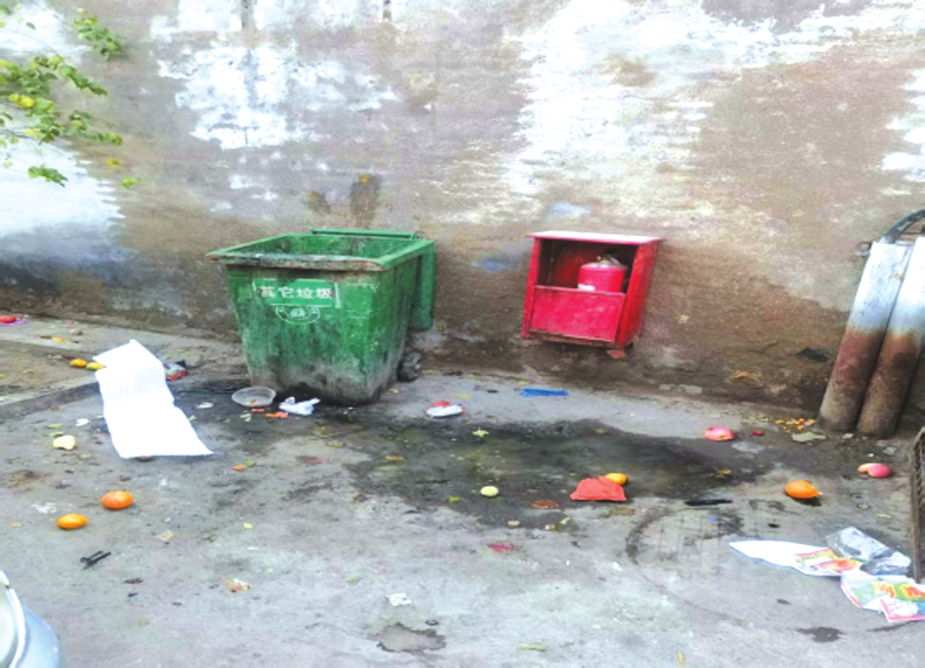 忻府區(qū)和平東街農(nóng)貿(mào)市場垃圾箱臟亂、消防器材缺失。