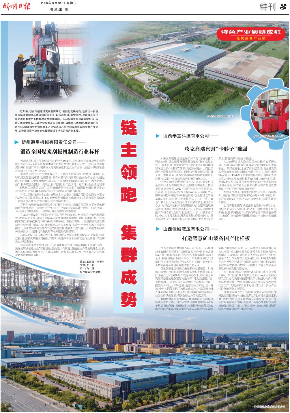 近年來,忻州市錨定煤炭裝備高端化、智能化發(fā)展方向,培育出一批在細(xì)分領(lǐng)域掌握核心技術(shù)的標(biāo)桿企業(yè),以忻通公司、泰寶科技、佳誠液壓為代表的煤機(jī)制造產(chǎn)業(yè)鏈集群正在快速崛起。從刮板輸送機(jī)到高端密封件,再到礦用重型裝備,三家企業(yè)分別在各自賽道打破海外技術(shù)壟斷、填補(bǔ)國內(nèi)技術(shù)空白,構(gòu)建起忻州煤機(jī)裝備產(chǎn)業(yè)鏈從核心部件到成套裝備的完整產(chǎn)業(yè)閉環(huán),為全國煤炭產(chǎn)業(yè)智能化轉(zhuǎn)型提供了堅(jiān)實(shí)的國產(chǎn)化支撐。
