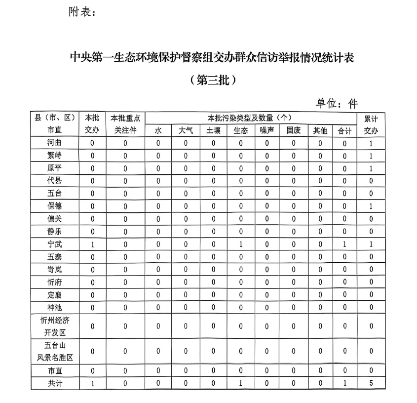 按區(qū)域和部門(mén)劃分,寧武縣1件。本批轉(zhuǎn)辦的信訪件,涉及生態(tài)環(huán)境問(wèn)題1個(gè),其中,生態(tài)破壞問(wèn)題1個(gè)。