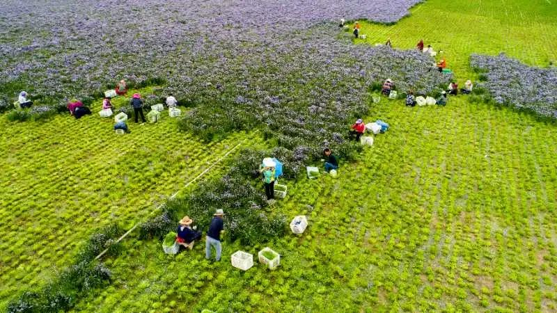 ▲小香蔥種植基地俯瞰圖 在右玉縣威遠(yuǎn)鎮(zhèn)小香蔥種植基地,連片種植的小香蔥長勢喜人。三五成群的農(nóng)民穿著雨鞋,蹲在地里用小鐮刀割蔥,割下一把后把雜草撿出來,把黃尖掐掉,干凈整齊地擺進(jìn)筐子里。