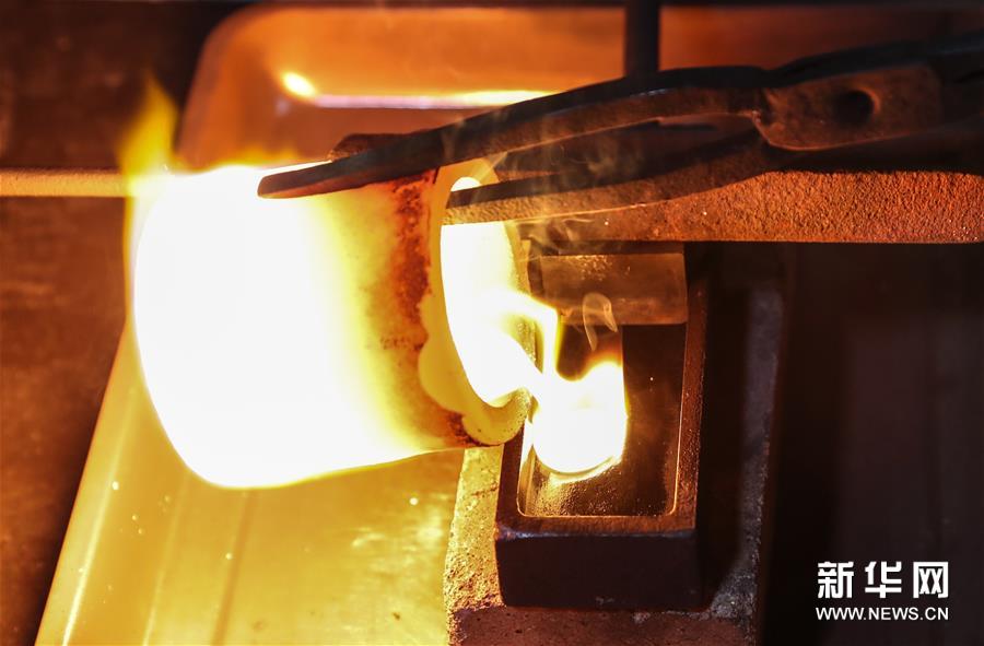 在南京金線金箔總廠,工人將熔化的金水倒入容器(2019年12月12日攝)。68歲的王必生是江蘇南京人,1973年進(jìn)入南京金箔鍛制技藝項(xiàng)目保護(hù)單位——南京金線金箔總廠,師從老藝人譚柱石,他虛心學(xué)習(xí),潛心鉆研,很快掌握打金箔的技藝。他致力于技術(shù)革新和改造,參與機(jī)械打箔機(jī)、自動(dòng)打箔機(jī)的研制。2009年他被評(píng)為國(guó)家級(jí)非物質(zhì)文化遺產(chǎn)項(xiàng)目南京金箔鍛制技藝代表性傳承人。 金箔鍛制技藝,俗稱“打金箔”,歷史悠久。在南京一些地方,金箔生產(chǎn)仍然延用古代傳下的制作工序,鍛制過(guò)程包括化金條、拍葉、做捻子、沾捻子、打開(kāi)子、裝開(kāi)子、出具、切箔等。 金箔廣泛應(yīng)用于建筑裝飾,還可應(yīng)用于雕塑、工藝品、書(shū)畫(huà)、食品藥品、服飾等方面的貼金裝飾和制作。南京金箔品種有真金箔、銅箔、銀箔、鋁箔,薄如蟬翼、色澤純正、厚薄均勻,產(chǎn)品銷(xiāo)往海內(nèi)外。 目前,王必生所在的南京金線金箔總廠是國(guó)家級(jí)非物質(zhì)文化遺產(chǎn)代表性項(xiàng)目保護(hù)單位。工廠把人工打金箔的遺址保護(hù)起來(lái),并成立了金箔大師工作室,加強(qiáng)金箔技藝的推廣,加大傳承人的培養(yǎng)力度。已經(jīng)退休的王必生被工廠返聘,負(fù)責(zé)打箔技藝展示和傳承。他說(shuō),現(xiàn)在機(jī)器打箔越來(lái)越多,但人工打出的金箔的更加柔軟,齊整。他希望這一傳統(tǒng)技藝能夠繼續(xù)傳承下去。新華社記者 楊磊 攝