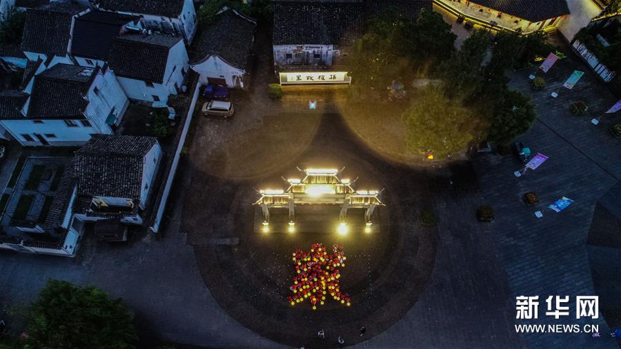 9月29日,龍門鎮(zhèn)文明志愿幫幫團(tuán)的志愿者提著花燈排成一個(gè)“家”字,慶祝古鎮(zhèn)廟會(huì)開(kāi)啟(無(wú)人機(jī)照片)。新華社記者 徐昱 攝
