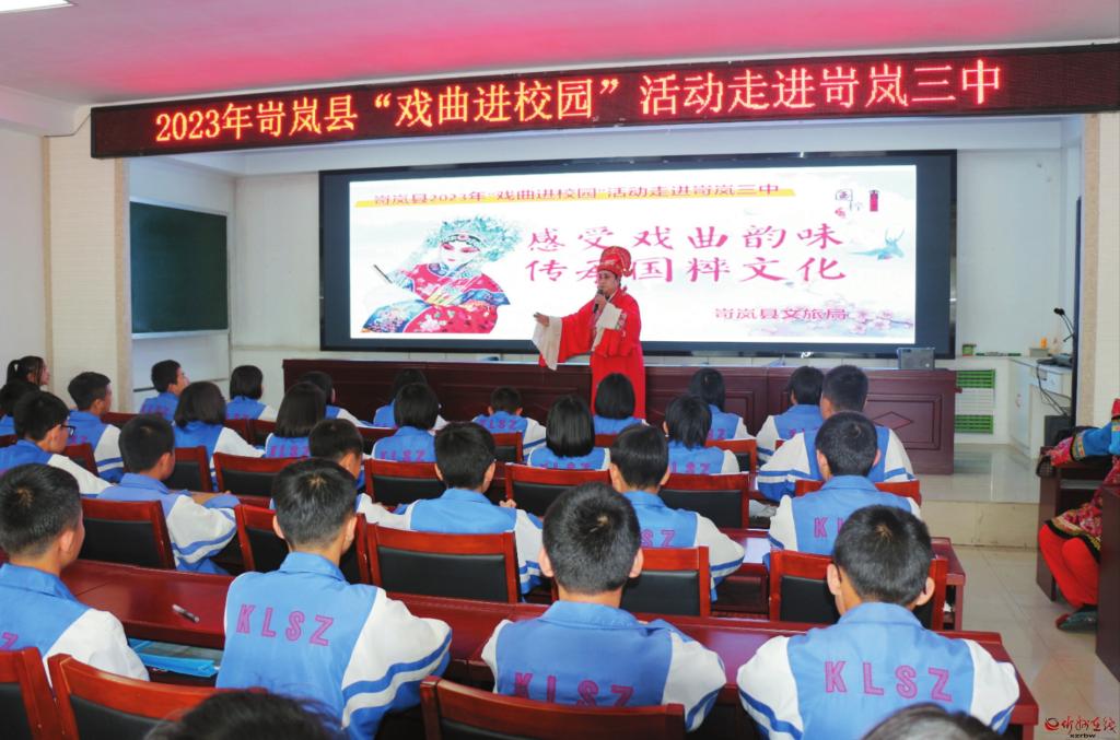 “樊梨花她好比鮮花一樣,練就了一套套飛龍花槍……”67歲的岢嵐縣晉劇團退休演員王潤花給岢嵐三中的同學(xué)們演繹晉劇《樊梨花》片斷,圓潤的唱腔加上演員的專業(yè)表演,引來臺下學(xué)生們的嘖嘖贊嘆;53歲的本土二人臺演員王藝文表演的《探親》選段,更是以生動、詼諧的表演和極富地方生活氣息的臺詞讓同學(xué)們投去欽佩的目光……當(dāng)演員們表示要現(xiàn)場教大家“比劃”時,同學(xué)們爭相上臺跟著學(xué)起來。這是近日岢嵐縣2023年“戲曲進(jìn)校園”活動走進(jìn)岢嵐三中的場景。