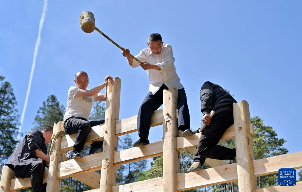 4月26日,在湖北省宣恩縣沙道溝鎮(zhèn)老岔村,村民在修建吊腳樓。