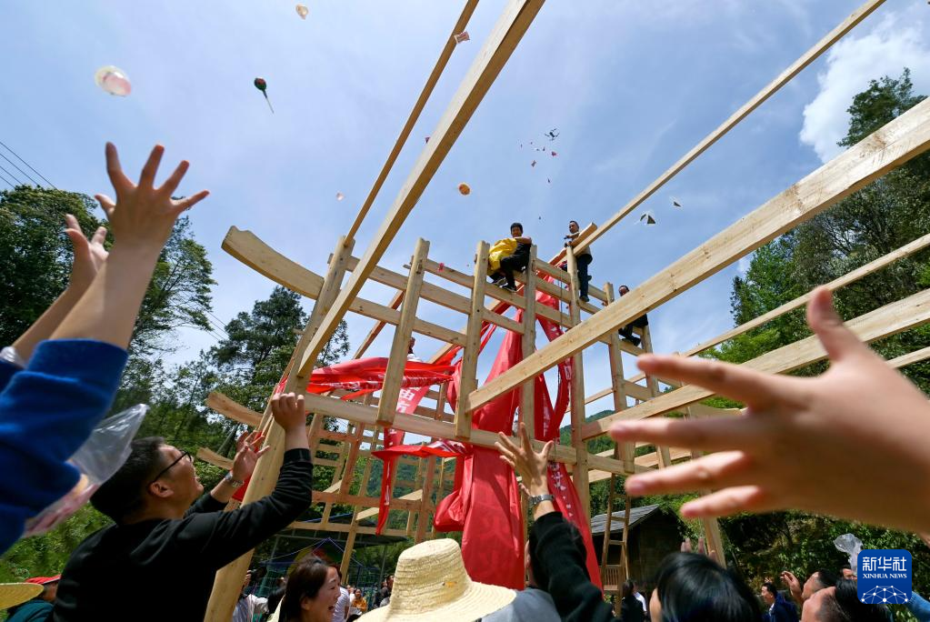 4月26日,在湖北省宣恩縣沙道溝鎮(zhèn)老岔村,村民在舉行吊腳樓落成儀式。