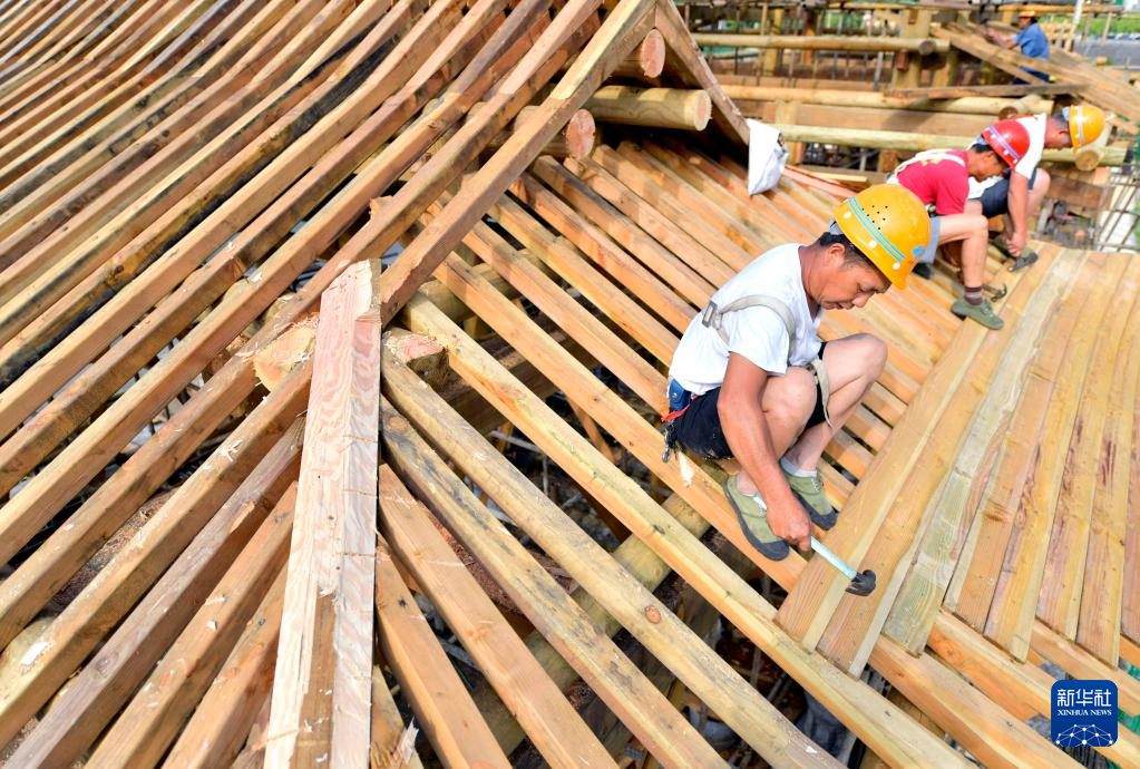 6月10日,木匠在湖北省宣恩縣城仙山貢水旅游區(qū)修建景觀吊腳樓。