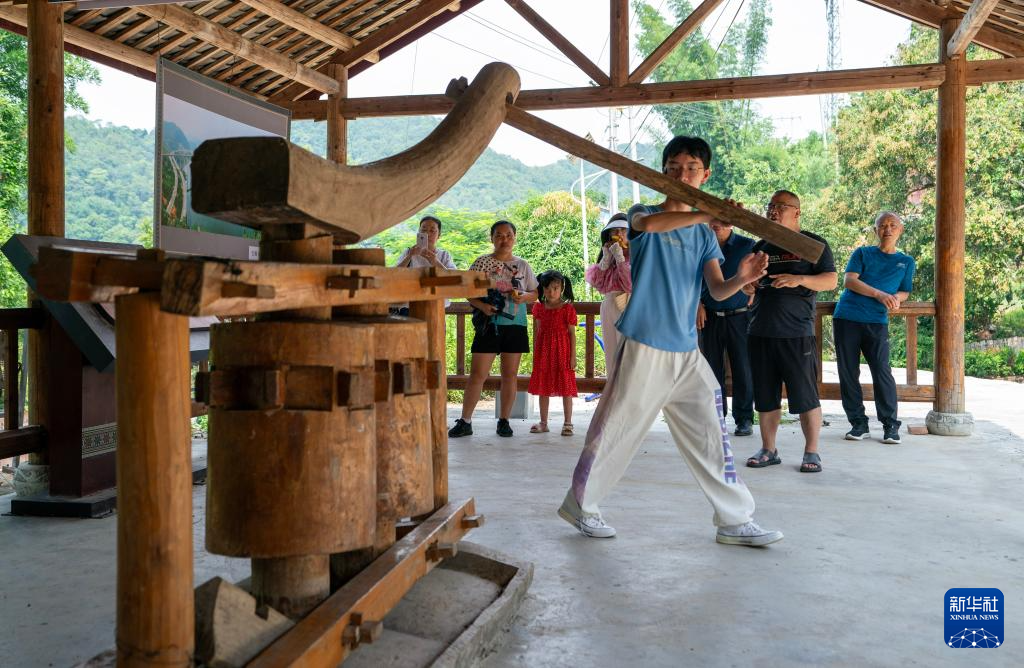 7月30日,一名游客在坡芽村內(nèi)體驗壯族傳統(tǒng)的甘蔗榨汁機。
